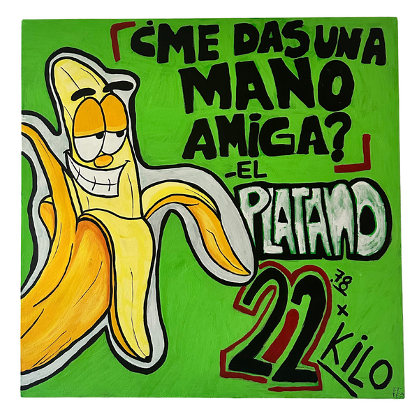 This piece draws inspiration from the playful erotic language of Mexico City’s tianguis, where fruit stands often use double entendres in their signs. The phrase “me das una mano amiga”, coming from a banana, becomes a cheeky pun — a classic albur — blending humor and subtle sensuality.