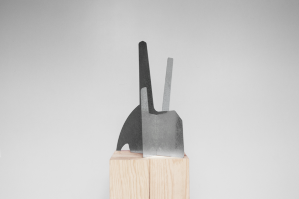 This sculpture contrasts the natural with the industrial. The base, made of light wood blocks, offers an organic feel, while the angular, minimalist metal piece on top introduces a modern, geometric approach. The combination of materials and forms creates visual tension, inviting reflection on the relationship between the natural world and urbanity.