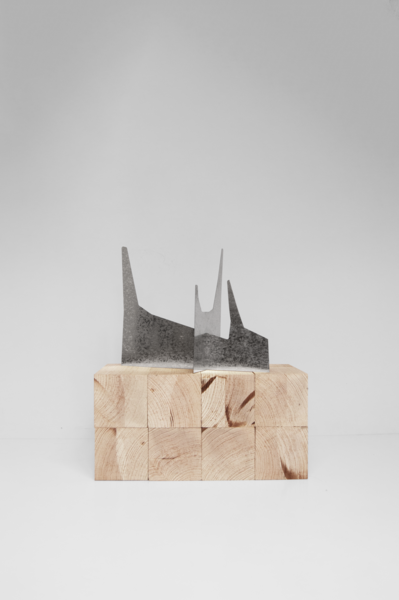 This sculpture contrasts the natural with the industrial. The base, made of light wood blocks, offers an organic feel, while the angular, minimalist metal piece on top introduces a modern, geometric approach. The combination of materials and forms creates visual tension, inviting reflection on the relationship between the natural world and urbanity.
