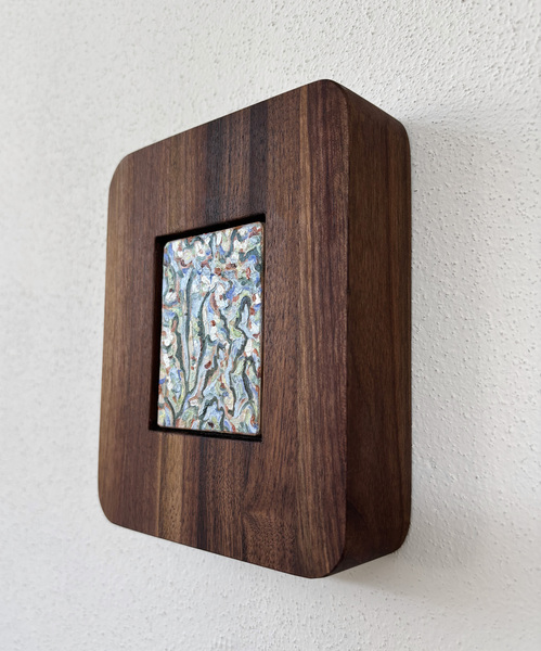 Óleo miniatura sobre triplay de caobilla montado en pieza de madera de nogal recuperada.