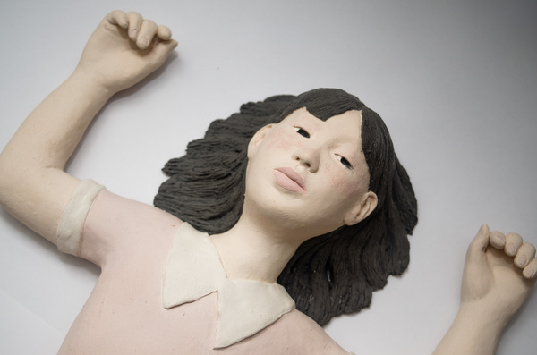 A girl lying down in a loose, relaxed pose, her gaze lifted toward the sky. Her stillness suggests a state between thought and drift, as if suspended between presence and daydream.