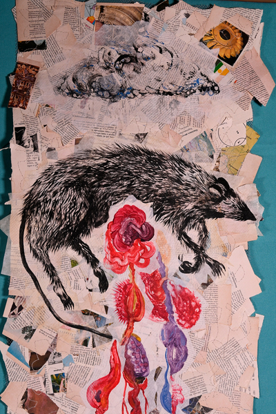 Elaborada con fragmentos triturados de una enciclopedia obsoleta, esta pieza combina bordado y monotipos en papel japonés. Sobre un lienzo construido manualmente, la artista representa el cuerpo de una rata de la que emergen vísceras coloridas e irreales, una imagen que oscila entre lo bello y lo inquietante, evocando la transformación y la persistencia de la vida.