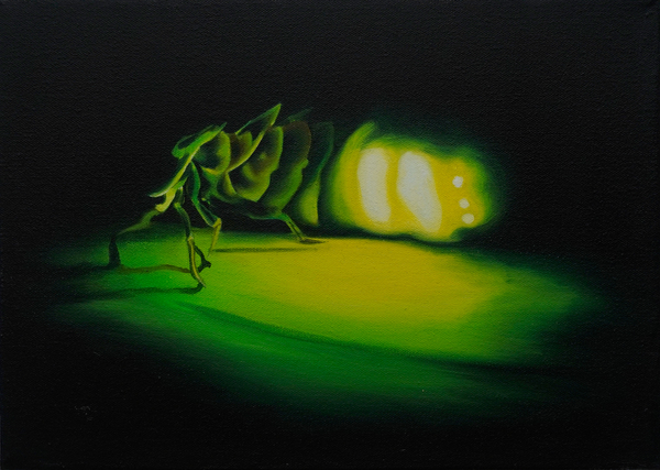 Brillaban, pero no las veíamos del todo. Las luciérnagas formaban parte del paisaje nocturno de la infancia: estaban ahí, titilando como pequeñas certezas en la oscuridad. No eran un espectáculo extraordinario ni algo que se buscará; eran presencia espontánea, testigos silenciosos de que el mundo aún guardaba misterios. Las veíamos brillar sin entender cómo lo hacían. Bastaba con saber que estaban ahí, que algo —en la noche— tenía el poder de encenderse. Hoy, casi han desaparecido. Y con ellas, también algo de nuestras infancias. Las luciérnagas son, para mí, la memoria viva de una forma de estar en el mundo que hoy se desvanece. Un instante suspendido entre la inocencia y la imaginación. Lo que se pierde no es solo un insecto, sino una manera de mirar, de explorar, de habitar la noche sin miedo. Pinto lo que apenas se alcanzaba a ver: el contorno de lo que fue. Las luciérnagas no se extinguieron solas; se llevaron consigo la calma de una noche sin ruido, la promesa de una luz que no buscaba ser vista. Quizás, al buscarlas nuevamente, logremos volver a habitar esa quietud.
