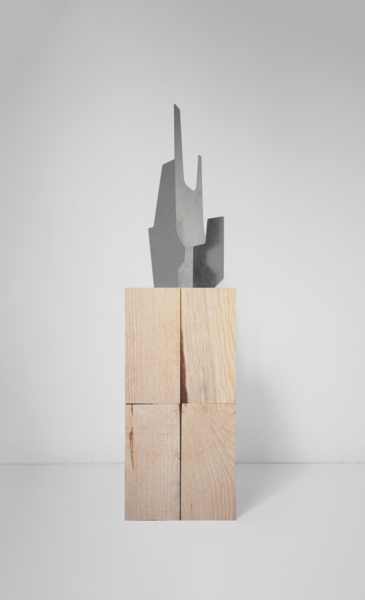 This sculpture contrasts the natural with the industrial. The base, made of light wood blocks, offers an organic feel, while the angular, minimalist metal piece on top introduces a modern, geometric approach. The combination of materials and forms creates visual tension, inviting reflection on the relationship between the natural world and urbanity.