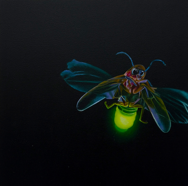 Brillaban, pero no las veíamos del todo. Las luciérnagas formaban parte del paisaje nocturno de la infancia: estaban ahí, titilando como pequeñas certezas en la oscuridad. No eran un espectáculo extraordinario ni algo que se buscará; eran presencia espontánea, testigos silenciosos de que el mundo aún guardaba misterios. Las veíamos brillar sin entender cómo lo hacían. Bastaba con saber que estaban ahí, que algo —en la noche— tenía el poder de encenderse. Hoy, casi han desaparecido. Y con ellas, también algo de nuestras infancias. Las luciérnagas son, para mí, la memoria viva de una forma de estar en el mundo que hoy se desvanece. Un instante suspendido entre la inocencia y la imaginación. Lo que se pierde no es solo un insecto, sino una manera de mirar, de explorar, de habitar la noche sin miedo. Pinto lo que apenas se alcanzaba a ver: el contorno de lo que fue. Las luciérnagas no se extinguieron solas; se llevaron consigo la calma de una noche sin ruido, la promesa de una luz que no buscaba ser vista. Quizás, al buscarlas nuevamente, logremos volver a habitar esa quietud.