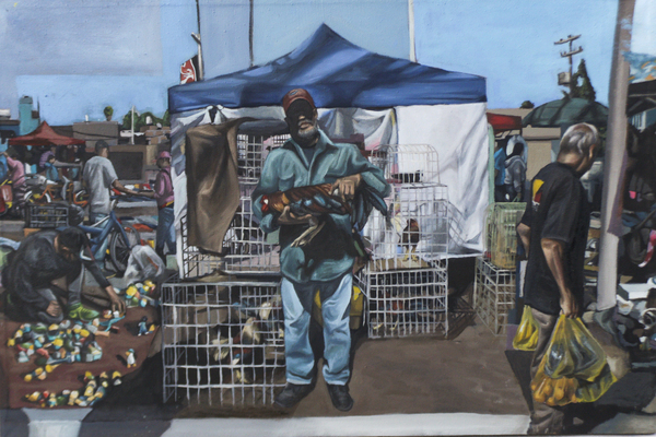 Exploración pictórica y material de los tianguis y las situaciones que se viven de manera cotidiana, generando una contemplación visual en estos espacios marginados, incorporando material recuperados en la composición de la obra.