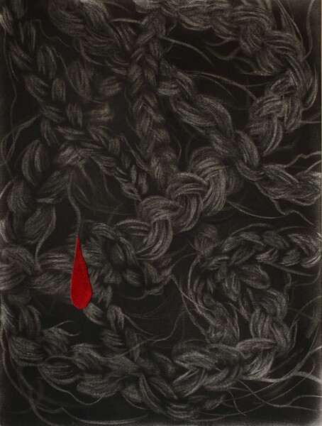 Una acumulación interminable de cabello trenzado y una gota suspendida por un cabello. Esta pieza habla sobre el poder simbólico que tienen actos cotidianos sobre nuestro día a día, nuestra salud emocional y mental, así como de las personas que imprimen el esfuerzo detrás de estos actos que sostienen mundos.