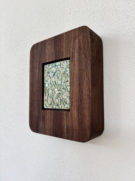 Óleo miniatura sobre triplay de caobilla montado en pieza de madera de nogal recuperada.