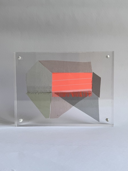 Serie de paisajes textiles donde casas hechas de retazos de tela flotan suspendidas entre dos placas de acrílico transparente, unidas por imanes. Inspirada por la canción *Little Boxes* de Malvina Reynolds en la que hace referencia al “suburban dream” donde todos son iguales y la construcción de las casas es endeble. Las piezas hablan de la fragilidad de los sueños de seguridad y pertenencia. Si los imanes se separan, las casas se desmoronan, revelando que lo que parece un hogar sólido es solo un conjunto de piezas sueltas. Utilizo textiles reciclados y la idea de lo imperfecto para cuestionar los modelos de vida prefabricados y celebrar la belleza de lo transitorio y lo interconectado.
