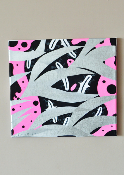 Abstract composition of a aquatic figura with eyes, plants and a pink sky.