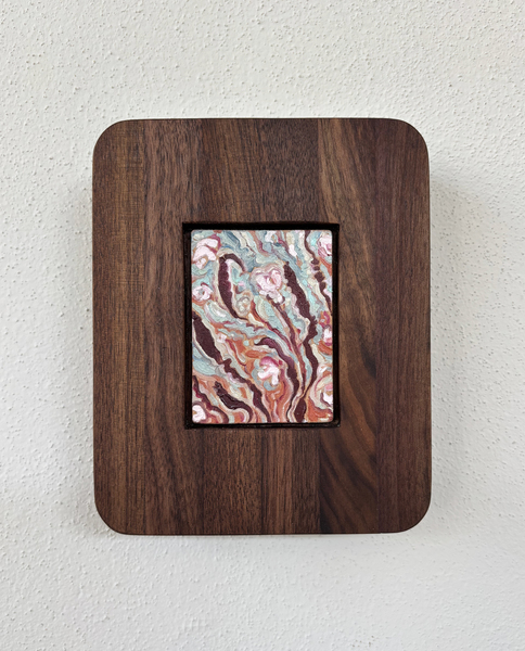 Óleo miniatura sobre triplay de caobilla montado en pieza de madera de nogal recuperada.