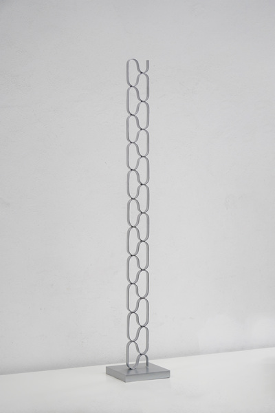 Formed in rolled stainless steel, Zenit rises as a vertical sequence of interconnected links — a continuous ascent that evokes both structure and suspension. Its rhythmic repetition suggests an infinite chain, yet its upward direction gestures toward release rather than confinement. The polished surface captures and diffuses light, reflecting the surroundings and blurring the boundary between material and space. Balancing precision and fragility, Zenit becomes a study of elevation — a meditation on tension, gravity, and the moment when matter transcends its own weight to touch the intangible.