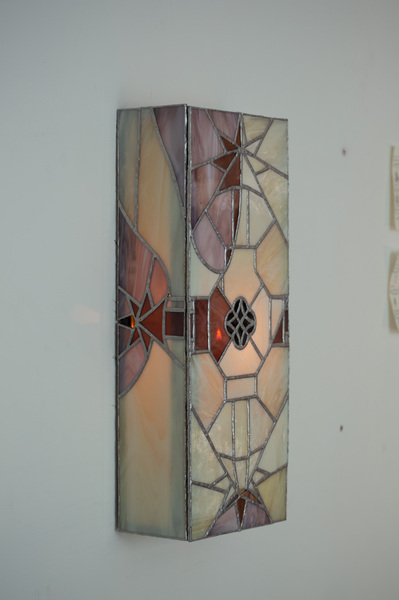 Candil I is a collectible lighting piece made using stained glass techniques. The rectangular lamp houses a candle that can be lit and replaced through a small door located on its left side.