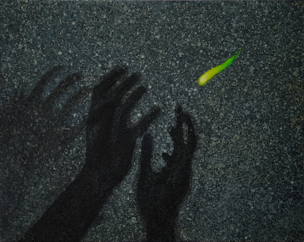 Brillaban, pero no las veíamos del todo. Las luciérnagas formaban parte del paisaje nocturno de la infancia: estaban ahí, titilando como pequeñas certezas en la oscuridad. No eran un espectáculo extraordinario ni algo que se buscará; eran presencia espontánea, testigos silenciosos de que el mundo aún guardaba misterios. Las veíamos brillar sin entender cómo lo hacían. Bastaba con saber que estaban ahí, que algo —en la noche— tenía el poder de encenderse. Hoy, casi han desaparecido. Y con ellas, también algo de nuestras infancias. Las luciérnagas son, para mí, la memoria viva de una forma de estar en el mundo que hoy se desvanece. Un instante suspendido entre la inocencia y la imaginación. Lo que se pierde no es solo un insecto, sino una manera de mirar, de explorar, de habitar la noche sin miedo. Pinto lo que apenas se alcanzaba a ver: el contorno de lo que fue. Las luciérnagas no se extinguieron solas; se llevaron consigo la calma de una noche sin ruido, la promesa de una luz que no buscaba ser vista. Quizás, al buscarlas nuevamente, logremos volver a habitar esa quietud.