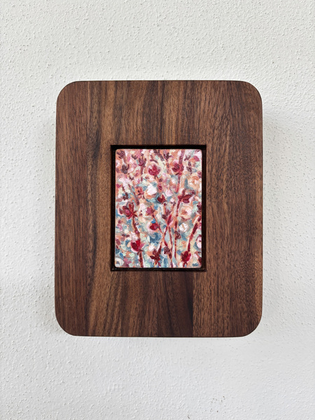 Óleo miniatura sobre triplay de caobilla montado en pieza de madera de nogal recuperada.