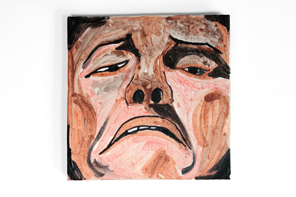 Part of a series of four hand-cut ceramic tiles featuring faces drawn from previous paintings: Sana sana, La venda, Las agujetas, and Mujer montículo. This work creates a bridge between my painting practice and ceramic pieces. Each tile measures approximately 16×16 cm and is hand-cut, resulting in subtle variations and imperfections from the firing and cutting process, which emphasize their unique, singular character.