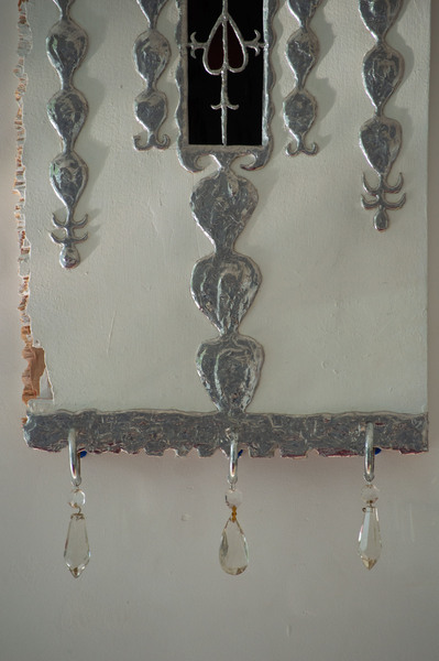 This piece was made from a discarded section of drywall recovered from a construction site. It is part of the artist’s exploration of form and material through the reinterpretation of stained glass techniques. At the center, a small stained glass element soldered with silver anchors the composition. Along the surface, acrylic reliefs are coated with copper tape and covered with melted solder, following the process used in traditional stained glass work. Three cut-glass pieces, reclaimed from an old chandelier, hang from the lower edge of the piece, reflecting light when illuminated by the sun.