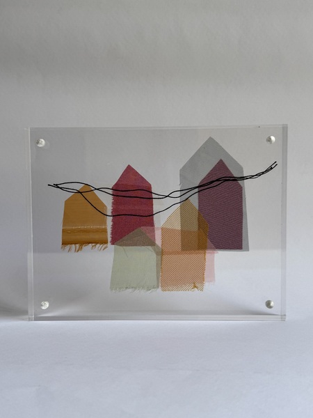 Serie de paisajes textiles donde casas hechas de retazos de tela flotan suspendidas entre dos placas de acrílico transparente, unidas por imanes. Inspirada por la canción *Little Boxes* de Malvina Reynolds en la que hace referencia al “suburban dream” donde todos son iguales y la construcción de las casas es endeble. Las piezas hablan de la fragilidad de los sueños de seguridad y pertenencia. Si los imanes se separan, las casas se desmoronan, revelando que lo que parece un hogar sólido es solo un conjunto de piezas sueltas. Utilizo textiles reciclados y la idea de lo imperfecto para cuestionar los modelos de vida prefabricados y celebrar la belleza de lo transitorio y lo interconectado.