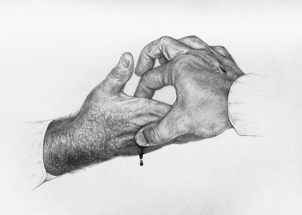 Trato de explorar la estética de la concepción de los rituales formales e informales del judeocristianismo en el mundo contemporáneo, utilizando como referencia conceptos derivados de los estudios cognitivos de la religión como el "Dispositivo de Detección de Agencia Hiperactivo" de Justin Barrett. Me interesa estudiar las características de lo que conocemos como religión así como su rol en nuestro proceso evolutivo. "Señal del clavo" retrata uno de los rituales que se realizan dentro de los templos de la Iglesia de Jesucristo De los Santos de los Últimos Días (mormones) en el que el oficiante comparte un sello tocando con su dedo pulgar e índice de la mano derecha el centro de la palma derecha de cada uno de los asistentes, haciendo alusión a las marcas de los clavos en las manos de Jesús.